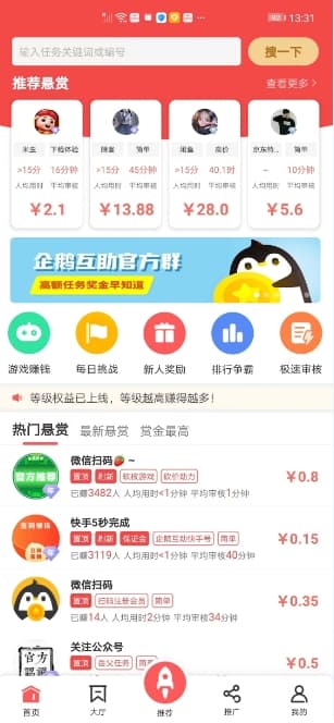 1、一款新上线的悬赏互助任务APP,类似于趣闲赚和集多猫,无需投入即可赚零花钱;