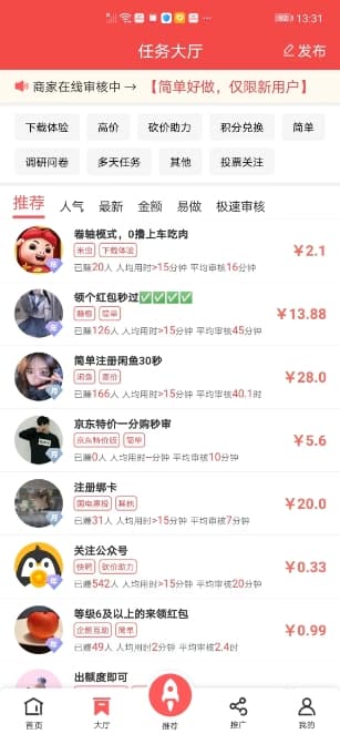 2、软件上有海量优质手机任务,如下载、砍价、点赞、投票、游戏、试玩、转发等;